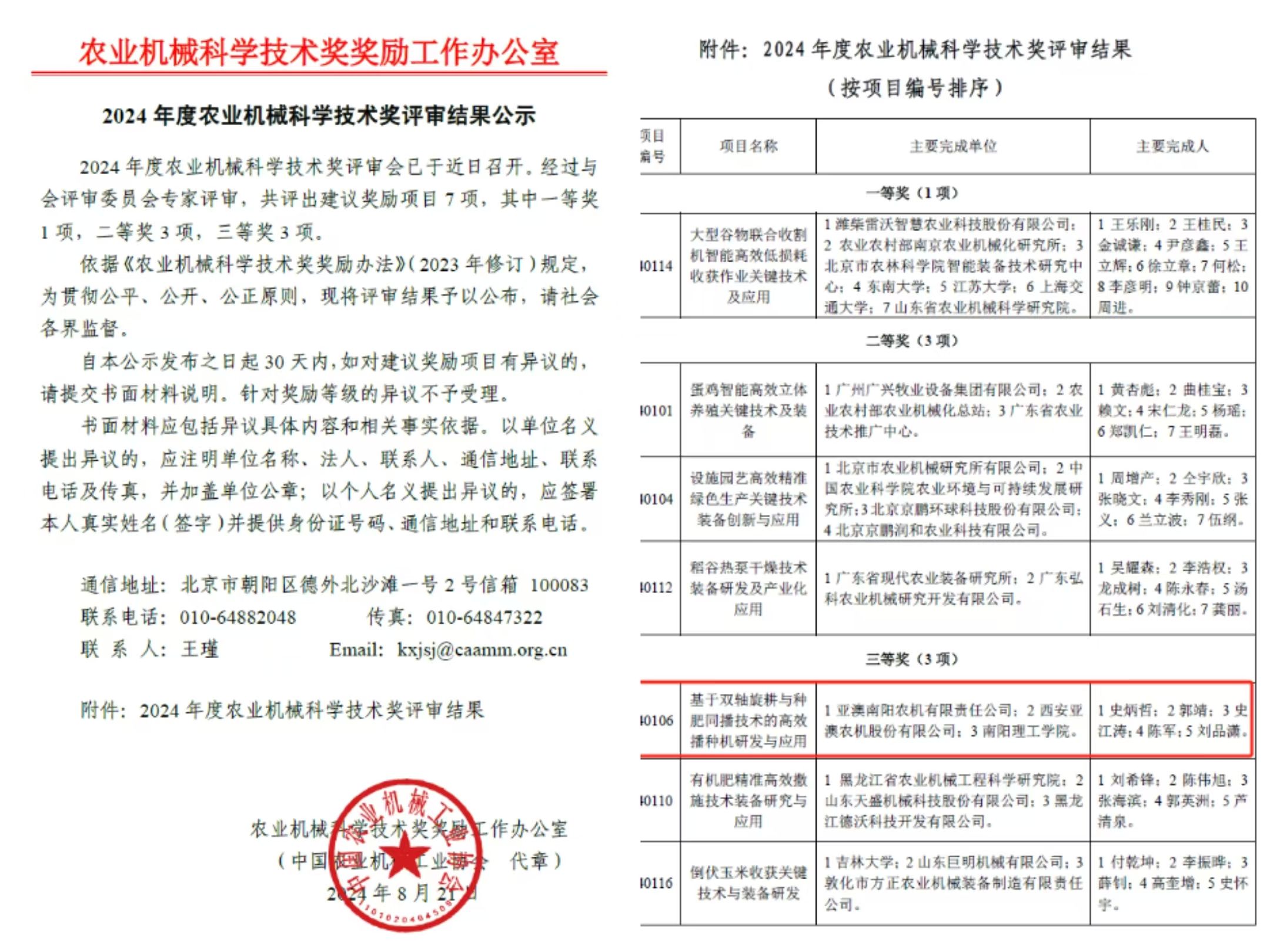 在科技與農(nóng)業(yè)深度融合的時代浪潮中,一則振奮人心的喜訊傳來 ——亞澳農(nóng)機成功榮獲農(nóng)業(yè)機械科學技術獎!