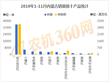 2019年1-11月,上榜內(nèi)蒙古用戶(hù)購(gòu)機(jī)量前十的農(nóng)機(jī)產(chǎn)品如下圖所示,輪式拖拉機(jī)、穴播機(jī)、免耕播種機(jī)等10種農(nóng)機(jī)合計(jì)購(gòu)買(mǎi)力5.86萬(wàn)臺(tái),是內(nèi)蒙古農(nóng)機(jī)總銷(xiāo)量的86.8%,對(duì)這10類(lèi)農(nóng)機(jī)的購(gòu)機(jī)支出達(dá)42.4億元。