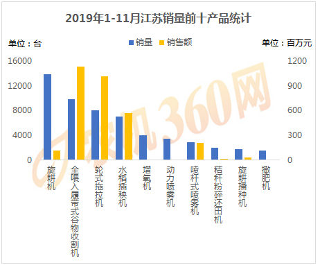 2019年1-11月,上榜江蘇用戶(hù)購(gòu)機(jī)量前十的農(nóng)機(jī)產(chǎn)品如下圖所示,旋耕機(jī)、全喂入履帶式谷物收、輪式拖拉機(jī)等10種農(nóng)機(jī)合計(jì)購(gòu)買(mǎi)力5.45萬(wàn)臺(tái),是江蘇農(nóng)機(jī)銷(xiāo)量的85.35%,對(duì)這10類(lèi)農(nóng)機(jī)的購(gòu)機(jī)支出達(dá)31.02億元。